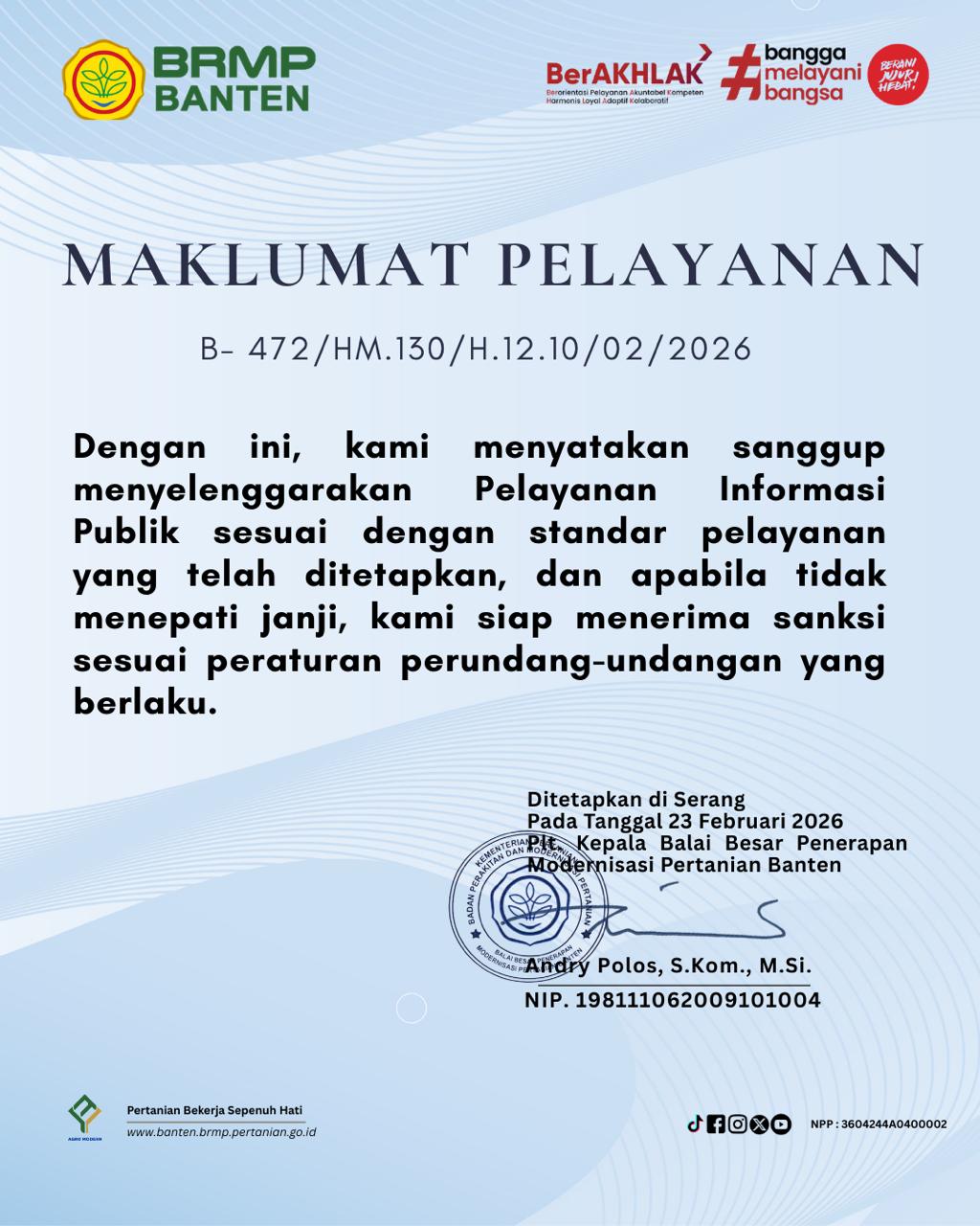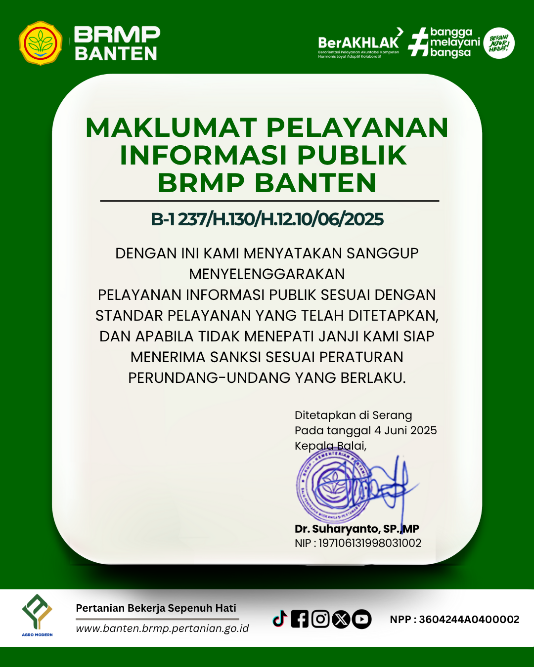 Sebagai badan publik, BRMP Banten berkomitmen menyelenggarakan pelayanan informasi publik yang sesuai standar dan sesuai peraturan perundang-undangan.