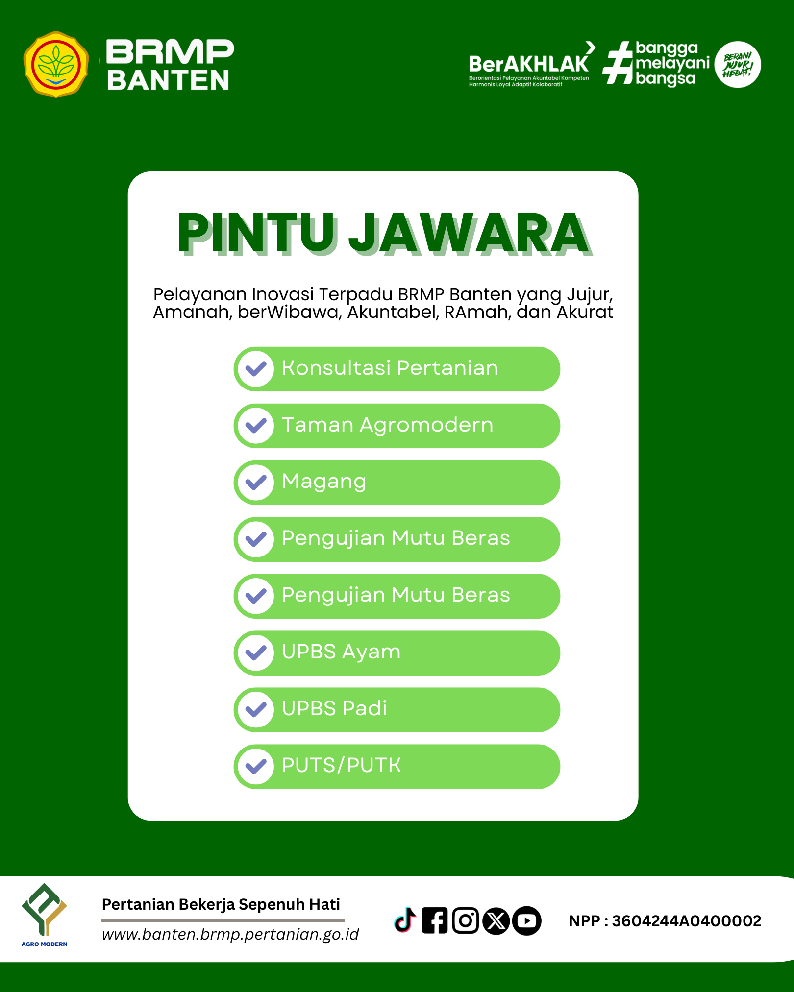 PINTU JAWARA adalah Pelayanan Inovasi Terpadu BRMP Banten yang Jujur, Amanah, berWibawa, Akuntabel, Ramah, Akurat (JAWARA).